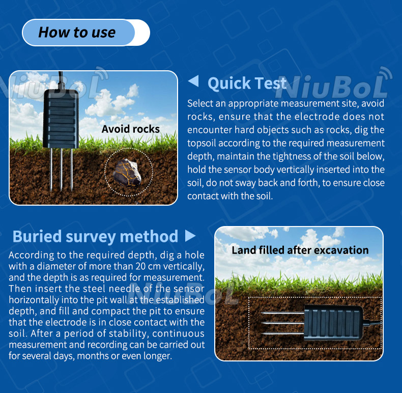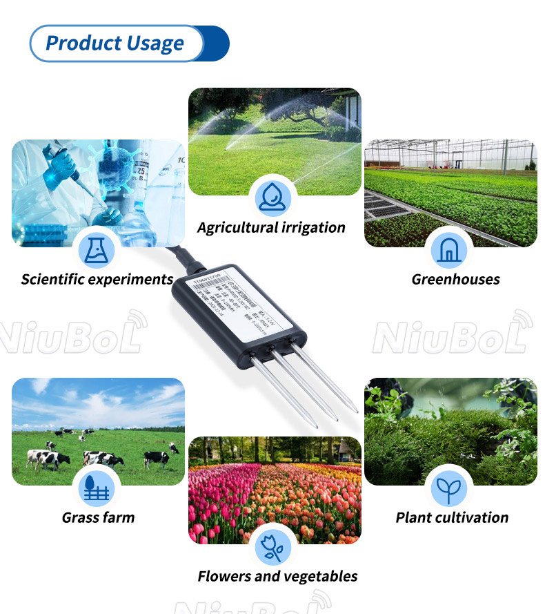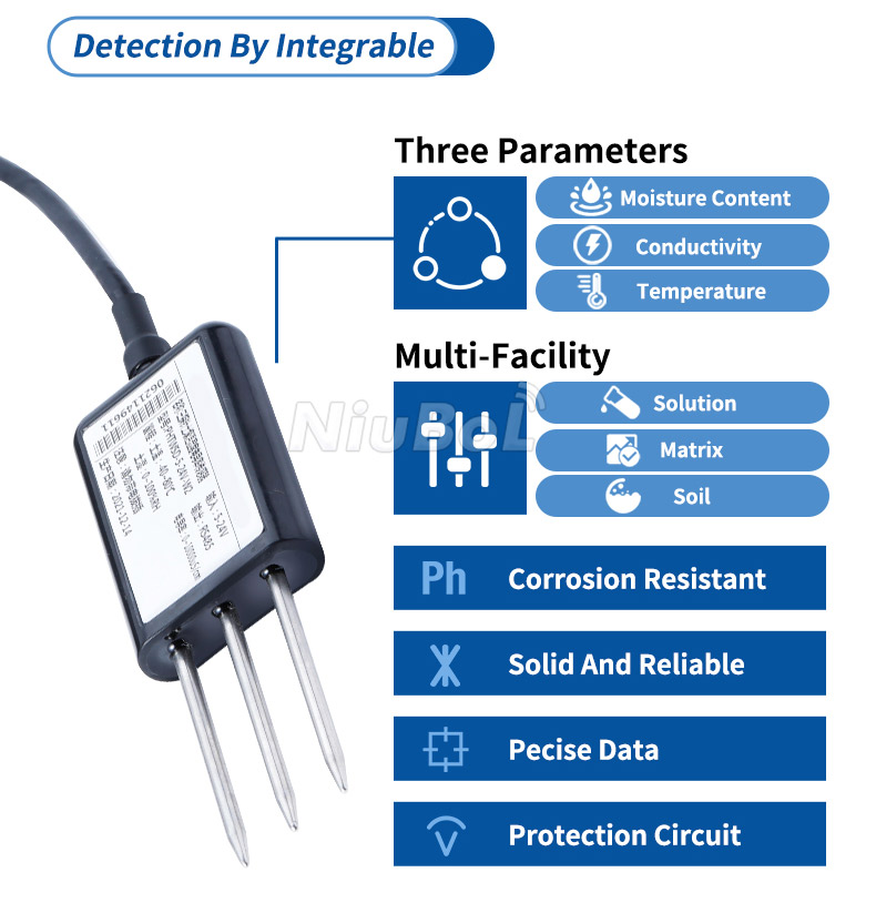 • Dual-parameter output: soil temperature and moisture in one probe.